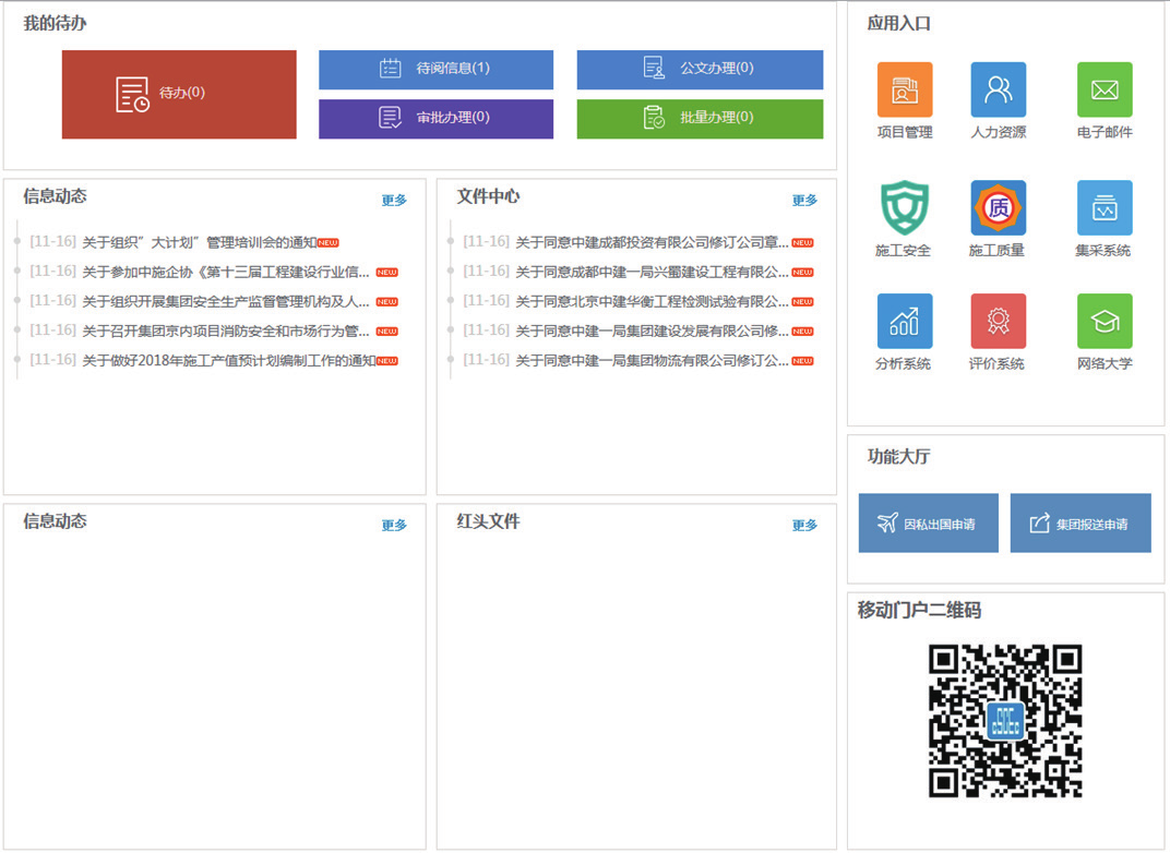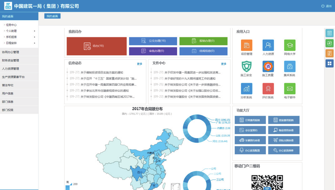 中建一局在 2007 年与金沙9001以诚为本合作,部署实施了协同办公平GLinkWorks4.3,随着信息技术的发展及公司业务的需要,在 2017 年升级到了 GLinkWorks7.0。并在此基础之上,依托金沙9001以诚为本提供的“协同 +”能力将各业务系统连接,以OA 组织架构为先决条件实现了单点登录、代办聚合、功能聚合;基于异构系统数据库统一,实现数据整合及业务应用为一体。通过异构系统的数据库开放,门户系统将各业务系统重点数据钻取、分析、统计,所生成结果以报表形式展现在各级门户上,同时结合 PC 端移动端数据同源,实现了随时随地随手办公的效果。真正为员工提供了快速发起通道,为辅助领导决策提供了有力支撑,最终实现集中管控业务、提供市场核心竞争力。