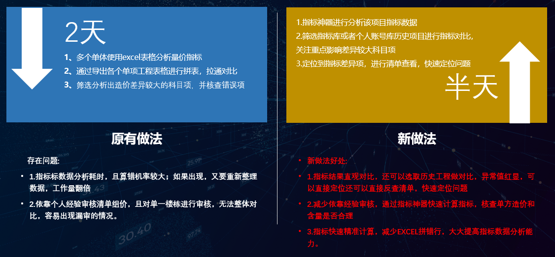 针对项目指标计算,原先需要将数据导入到excel中,检查数据及输入,耗时耗力。现在项目可以能过指标神器直接导入计价文件,快速计算指标及项目指标信息对比分析。