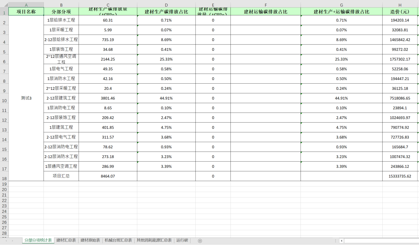 支持计算结果的一键导出,包含(分部分项、建材类别、建材原始、机械能源、其他能源、运行)6个excel表格