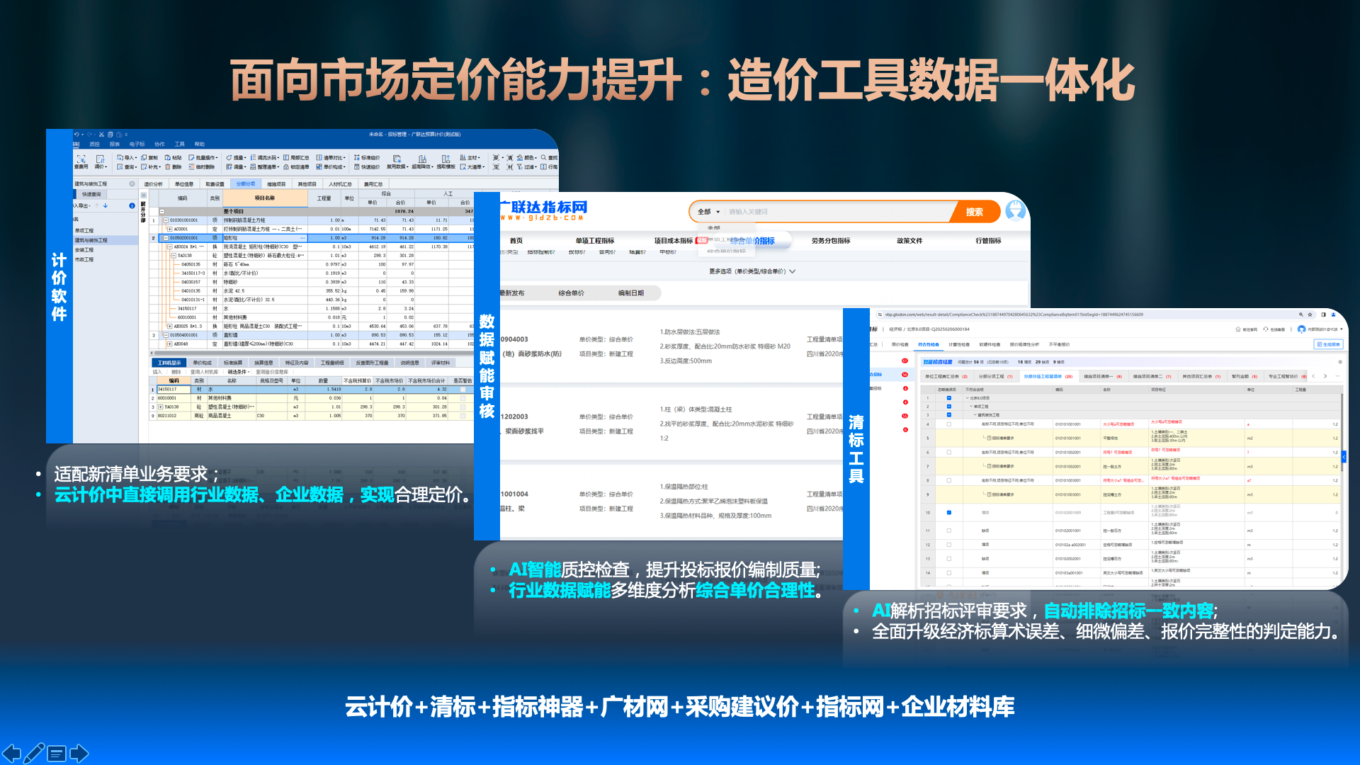 围绕造价市场化背景下招投标编、清、审业务,提供造价工具数据一体化方案,