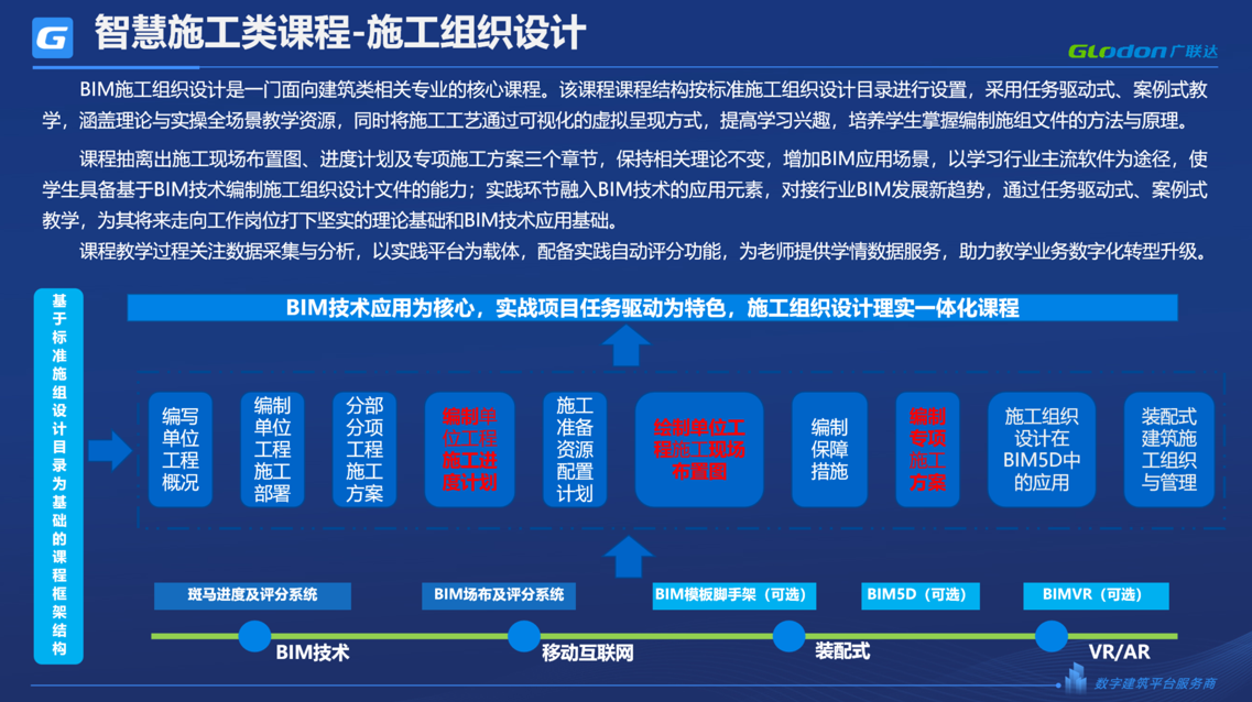 《BIM施工组织设计》课程按标准施工组织设计目录进行设置,采用任务驱动式、案例式教学,涵盖理论与实操全场景教学资源,同时将施工工艺通过可视化的虚拟呈现方式,提高学习兴趣,培养学生掌握编制施组文件的方法与原理。